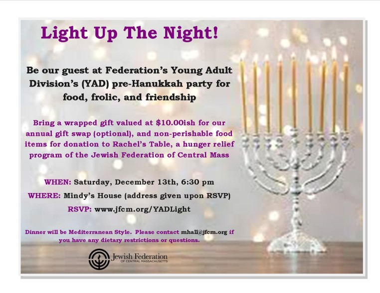 Be our guest at Federation’s Young Adult Division’s (YAD) pre-Hanukkah party for food, frolic, and friendship.